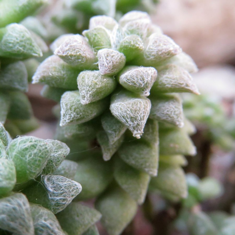 Ses minuscules feuilles charnues, d’un vert pâle, sont recouvertes de délicats filaments blancs rappelant des toiles d’araignées, ce qui lui confère un charme singulier. Le genre Anacampseros regroupe des plantes succulentes herbacées et se divise en trois catégories distinctes : Anacampseros, Avonia, et Grahamia, chacune présentant des caractéristiques uniques adaptées à leur milieu naturel aride.
