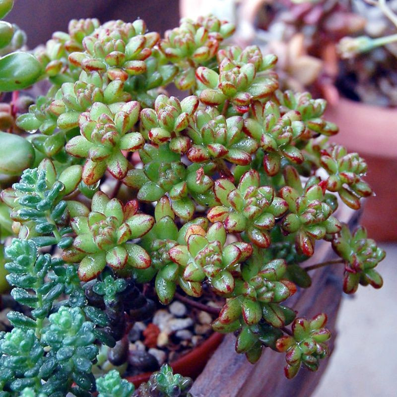 Aeonium sedifolium est une charmante petite plante succulente appartenant à la vaste famille des Crassulaceae. Originaire des îles Canaries, plus précisément de Tenerife, cette espèce se distingue par sa silhouette compacte ; elle forme des rosettes denses de feuilles charnues, vert vif, parfois bordées de rouge ou bronze sous le soleil.