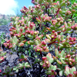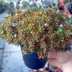 Aeonium sedifolium est une succulente de petite taille formant un buisson dense et ramifié d’environ 15 à 30 cm de hauteur. Ses tiges charnues, de couleur brun-rougeâtre, se lignifient partiellement avec l’âge.