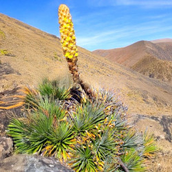 Puya yakespala est une plante appartenant à la famille des Bromeliaceae. Originaire des régions andines d'Amérique du Sud, notamment de la province argentine de Salta, elle se développe principalement dans les zones montagneuses arides et semi-arides, entre 2 000 et 4 000 mètres d'altitude. Cette espèce est particulièrement adaptée aux conditions extrêmes, telles que les températures froides et les sols pauvres. Elle est souvent observée sur des pentes rocheuses
