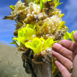 Originaire des régions arides de la province de Salta, au nord-ouest de l'Argentine, le Puya yakespala est une broméliacée de grande taille, remarquable pour sa résistance à la sécheresse et au froid (jusqu'à -10°C). Cette plante forme de larges rosettes de feuilles étroites, épineuses, vert clair sur le dessus et blanchâtres en dessous. Son inflorescence spectaculaire, en forme de massue ou de trèfle, porte un cône de fleurs jaune citron aux étamines vertes. Adapté aux zones tempérées sèches, le Puya yakespala prospère dans un sol parfaitement drainé, en pot comme en pleine terre, et doit être protégé de l'humidité excessive, surtout en hiver. Il constitue ainsi un excellent ornement pour les jardins secs.